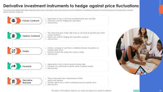 This slide shows detailed information regarding various types of derivative instruments which are used by individuals or institutional investors for investment purpose. It includes future contracts, options contracts, swaps, etc. If you are looking for a format to display your unique thoughts, then the professionally designed Derivative Investment Instruments To Hedge Understanding Investment Banking Framework Fin SS V is the one for you. You can use it as a Google Slides template or a PowerPoint template. Incorporate impressive visuals, symbols, images, and other charts. Modify or reorganize the text boxes as you desire. Experiment with shade schemes and font pairings. Alter, share or cooperate with other people on your work. Download Derivative Investment Instruments To Hedge Understanding Investment Banking Framework Fin SS V and find out how to give a successful presentation. Present a perfect display to your team and make your presentation unforgettable. This slide shows detailed information regarding various types of derivative instruments which are used by individuals or institutional investors for investment purpose. It includes future contracts, options contracts, swaps, etc.