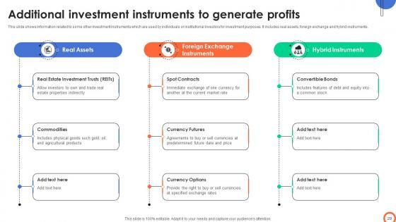 This slide shows information related to some other investment instruments which are used by individuals or institutional investors for investment purposes. It includes real assets, foreign exchange and hybrid instruments. Boost your pitch with our creative Additional Investment Instruments To Understanding Investment Banking Framework Fin SS V. Deliver an awe-inspiring pitch that will mesmerize everyone. Using these presentation templates you will surely catch everyones attention. You can browse the ppts collection on our website. We have researchers who are experts at creating the right content for the templates. So you do not have to invest time in any additional work. Just grab the template now and use them. This slide shows information related to some other investment instruments which are used by individuals or institutional investors for investment purposes. It includes real assets, foreign exchange and hybrid instruments.
