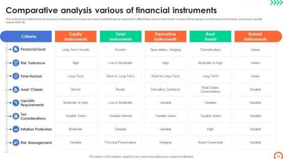 This slide shows matrix which can be used by individuals to compare and select suitable financial instrument. It differentiate various instruments on basis of financial goal, risk tolerance, time horizon, asset class, liquidity requirement, etc. Present like a pro with Comparative Analysis Various Of Financial Instruments Understanding Investment Banking Framework Fin SS V. Create beautiful presentations together with your team, using our easy-to-use presentation slides. Share your ideas in real-time and make changes on the fly by downloading our templates. So whether you are in the office, on the go, or in a remote location, you can stay in sync with your team and present your ideas with confidence. With Slidegeeks presentation got a whole lot easier. Grab these presentations today. This slide shows matrix which can be used by individuals to compare and select suitable financial instrument. It differentiate various instruments on basis of financial goal, risk tolerance, time horizon, asset class, liquidity requirement, etc.