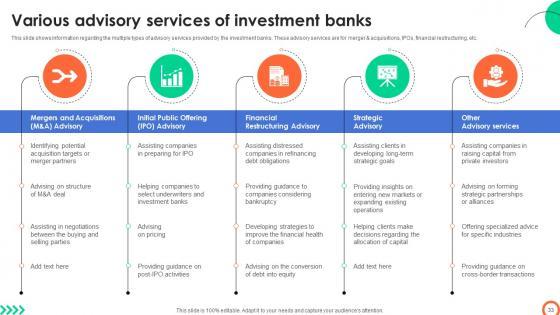 This slide shows information regarding the multiple types of advisory services provided by the investment banks. These advisory services are for merger and acquisitions, IPOs, financial restructuring, etc. The Various Advisory Services Of Investment Banks Understanding Investment Banking Framework Fin SS V is a compilation of the most recent design trends as a series of slides. It is suitable for any subject or industry presentation, containing attractive visuals and photo spots for businesses to clearly express their messages. This template contains a variety of slides for the user to input data, such as structures to contrast two elements, bullet points, and slides for written information. Slidegeeks is prepared to create an impression. This slide shows information regarding the multiple types of advisory services provided by the investment banks. These advisory services are for merger and acquisitions, IPOs, financial restructuring, etc.