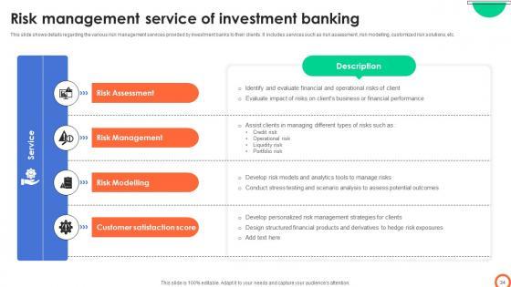 This slide shows details regarding the various risk management services provided by investment banks to their clients. It includes services such as risk assessment, risk modelling, customized risk solutions, etc. The Risk Management Service Of Investment Banking Understanding Investment Banking Framework Fin SS V is a compilation of the most recent design trends as a series of slides. It is suitable for any subject or industry presentation, containing attractive visuals and photo spots for businesses to clearly express their messages. This template contains a variety of slides for the user to input data, such as structures to contrast two elements, bullet points, and slides for written information. Slidegeeks is prepared to create an impression. This slide shows details regarding the various risk management services provided by investment banks to their clients. It includes services such as risk assessment, risk modelling, customized risk solutions, etc.
