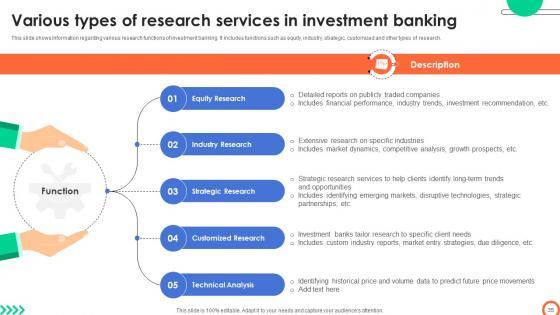 This slide shows information regarding various research functions of investment banking. It includes functions such as equity, industry, strategic, customized and other types of research. Retrieve professionally designed Various Types Of Research Services In Understanding Investment Banking Framework Fin SS V to effectively convey your message and captivate your listeners. Save time by selecting pre-made slideshows that are appropriate for various topics, from business to educational purposes. These themes come in many different styles, from creative to corporate, and all of them are easily adjustable and can be edited quickly. Access them as PowerPoint templates or as Google Slides themes. You do not have to go on a hunt for the perfect presentation because Slidegeeks got you covered from everywhere. This slide shows information regarding various research functions of investment banking. It includes functions such as equity, industry, strategic, customized and other types of research.