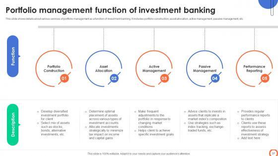 This slide shows details about various services of portfolio management as a function of investment banking. It includes portfolio construction, asset allocation, active management, passive management, etc. Welcome to our selection of the Portfolio Management Function Of Investment Understanding Investment Banking Framework Fin SS V. These are designed to help you showcase your creativity and bring your sphere to life. Planning and Innovation are essential for any business that is just starting out. This collection contains the designs that you need for your everyday presentations. All of our PowerPoints are 100Percent editable, so you can customize them to suit your needs. This multi-purpose template can be used in various situations. Grab these presentation templates today. This slide shows details about various services of portfolio management as a function of investment banking. It includes portfolio construction, asset allocation, active management, passive management, etc.