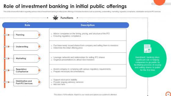 This slide shows information regarding various roles of investment banking in initial public offerings. It includes functions such as planning, underwriting, marketing, regulatory compliance, stabilization and post-IPO services. Retrieve professionally designed Role Of Investment Banking In Initial Public Understanding Investment Banking Framework Fin SS V to effectively convey your message and captivate your listeners. Save time by selecting pre-made slideshows that are appropriate for various topics, from business to educational purposes. These themes come in many different styles, from creative to corporate, and all of them are easily adjustable and can be edited quickly. Access them as PowerPoint templates or as Google Slides themes. You do not have to go on a hunt for the perfect presentation because Slidegeeks got you covered from everywhere. This slide shows information regarding various roles of investment banking in initial public offerings. It includes functions such as planning, underwriting, marketing, regulatory compliance, stabilization and post-IPO services.