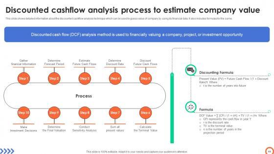 This slide shows detailed information about the discounted cashflow analysis technique which can be used to guess value of company by using its financial data. It also includes formulas for the same. Make sure to capture your audiences attention in your business displays with our gratis customizable Discounted Cashflow Analysis Process To Understanding Investment Banking Framework Fin SS V. These are great for business strategies, office conferences, capital raising or task suggestions. If you desire to acquire more customers for your tech business and ensure they stay satisfied, create your own sales presentation with these plain slides. This slide shows detailed information about the discounted cashflow analysis technique which can be used to guess value of company by using its financial data. It also includes formulas for the same.