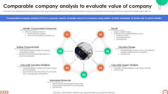 This slide shows detailed process of comparable company analysis technique which can be used to estimate value of company by using data of similar company. It includes steps such as identify, gather data, etc. Do you have to make sure that everyone on your team knows about any specific topic I yes, then you should give Comparable Company Analysis To Evaluate Understanding Investment Banking Framework Fin SS V a try. Our experts have put a lot of knowledge and effort into creating this impeccable Comparable Company Analysis To Evaluate Understanding Investment Banking Framework Fin SS V. You can use this template for your upcoming presentations, as the slides are perfect to represent even the tiniest detail. You can download these templates from the Slidegeeks website and these are easy to edit. So grab these today This slide shows detailed process of comparable company analysis technique which can be used to estimate value of company by using data of similar company. It includes steps such as identify, gather data, etc.