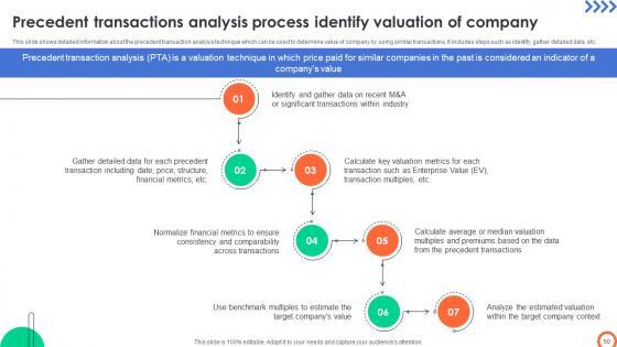 This slide shows detailed information about the precedent transaction analysis technique which can be used to determine value of company by using similar transactions. It includes steps such as identify, gather detailed data, etc. Explore a selection of the finest Precedent Transactions Analysis Process Identify Understanding Investment Banking Framework Fin SS V here. With a plethora of professionally designed and pre-made slide templates, you can quickly and easily find the right one for your upcoming presentation. You can use our Precedent Transactions Analysis Process Identify Understanding Investment Banking Framework Fin SS V to effectively convey your message to a wider audience. Slidegeeks has done a lot of research before preparing these presentation templates. The content can be personalized and the slides are highly editable. Grab templates today from Slidegeeks. This slide shows detailed information about the precedent transaction analysis technique which can be used to determine value of company by using similar transactions. It includes steps such as identify, gather detailed data, etc.
