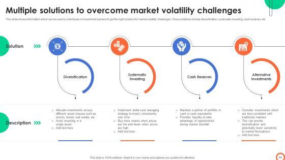 This slide shows information which can be used by individuals or investment bankers to get the right solution for market volatility challenges. These solutions include diversification, systematic investing, cash reserves, etc. Do you know about Slidesgeeks Multiple Solutions To Overcome Market Volatility Understanding Investment Banking Framework Fin SS V These are perfect for delivering any kind od presentation. Using it, create PowerPoint presentations that communicate your ideas and engage audiences. Save time and effort by using our pre-designed presentation templates that are perfect for a wide range of topic. Our vast selection of designs covers a range of styles, from creative to business, and are all highly customizable and easy to edit. Download as a PowerPoint template or use them as Google Slides themes. This slide shows information which can be used by individuals or investment bankers to get the right solution for market volatility challenges. These solutions include diversification, systematic investing, cash reserves, etc.