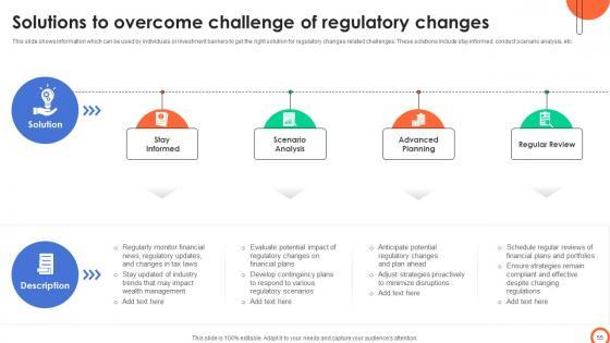 This slide shows information which can be used by individuals or investment bankers to get the right solution for regulatory changes related challenges. These solutions include stay informed, conduct scenario analysis, etc. Presenting this PowerPoint presentation, titled Solutions To Overcome Challenge Of Regulatory Understanding Investment Banking Framework Fin SS V, with topics curated by our researchers after extensive research. This editable presentation is available for immediate download and provides attractive features when used. Download now and captivate your audience. Presenting this Solutions To Overcome Challenge Of Regulatory Understanding Investment Banking Framework Fin SS V. Our researchers have carefully researched and created these slides with all aspects taken into consideration. This is a completely customizable Solutions To Overcome Challenge Of Regulatory Understanding Investment Banking Framework Fin SS V that is available for immediate downloading. Download now and make an impact on your audience. Highlight the attractive features available with our PPTs. This slide shows information which can be used by individuals or investment bankers to get the right solution for regulatory changes related challenges. These solutions include stay informed, conduct scenario analysis, etc.