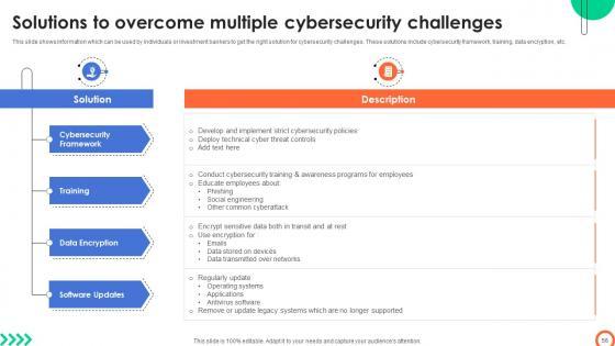 This slide shows information which can be used by individuals or investment bankers to get the right solution for cybersecurity challenges. These solutions include cybersecurity framework, training, data encryption, etc. Here you can discover an assortment of the finest PowerPoint and Google Slides templates. With these templates, you can create presentations for a variety of purposes while simultaneously providing your audience with an eye-catching visual experience. Download Solutions To Overcome Multiple Cybersecurity Understanding Investment Banking Framework Fin SS V to deliver an impeccable presentation. These templates will make your job of preparing presentations much quicker, yet still, maintain a high level of quality. Slidegeeks has experienced researchers who prepare these templates and write high-quality content for you. Later on, you can personalize the content by editing the Solutions To Overcome Multiple Cybersecurity Understanding Investment Banking Framework Fin SS V. This slide shows information which can be used by individuals or investment bankers to get the right solution for cybersecurity challenges. These solutions include cybersecurity framework, training, data encryption, etc.