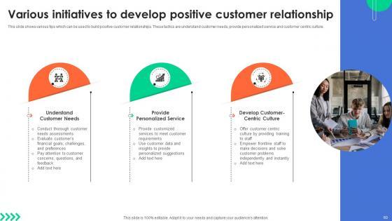 This slide shows various tips which can be used to build positive customer relationships. These tactics are understand customer needs, provide personalized service and customer centric culture. Are you searching for a Various Initiatives To Develop Positive Understanding Investment Banking Framework Fin SS V that is uncluttered, straightforward, and original Its easy to edit, and you can change the colors to suit your personal or business branding. For a presentation that expresses how much effort you have put in, this template is ideal With all of its features, including tables, diagrams, statistics, and lists, its perfect for a business plan presentation. Make your ideas more appealing with these professional slides. Download Various Initiatives To Develop Positive Understanding Investment Banking Framework Fin SS V from Slidegeeks today. This slide shows various tips which can be used to build positive customer relationships. These tactics are understand customer needs, provide personalized service and customer centric culture.