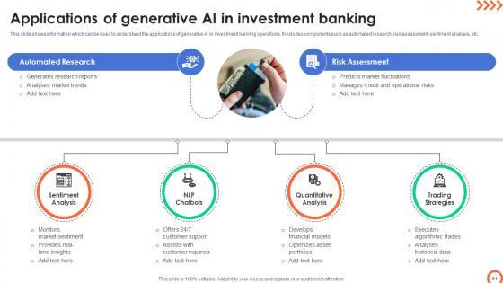 This slide shows information which can be used to understand the applications of generative AI in investment banking operations. It includes components such as automated research, risk assessment, sentiment analysis, etc. Slidegeeks is one of the best resources for PowerPoint templates. You can download easily and regulate Applications Of Generative AI In Investment Understanding Investment Banking Framework Fin SS V for your personal presentations from our wonderful collection. A few clicks is all it takes to discover and get the most relevant and appropriate templates. Use our Templates to add a unique zing and appeal to your presentation and meetings. All the slides are easy to edit and you can use them even for advertisement purposes. This slide shows information which can be used to understand the applications of generative AI in investment banking operations. It includes components such as automated research, risk assessment, sentiment analysis, etc.