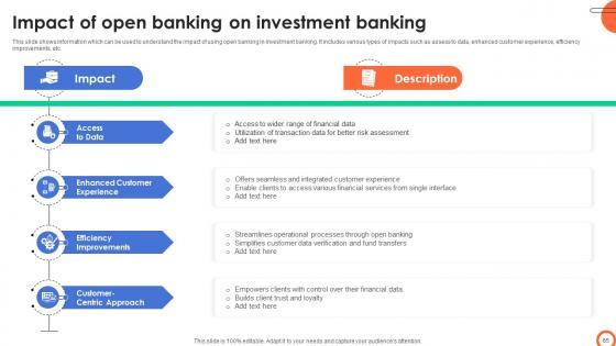 This slide shows information which can be used to understand the impact of using open banking in investment banking. It includes various types of impacts such as assess to data, enhanced customer experience, efficiency improvements, etc. This Impact Of Open Banking On Investment Banking Understanding Investment Banking Framework Fin SS V is perfect for any presentation, be it in front of clients or colleagues. It is a versatile and stylish solution for organizing your meetings. The Impact Of Open Banking On Investment Banking Understanding Investment Banking Framework Fin SS V features a modern design for your presentation meetings. The adjustable and customizable slides provide unlimited possibilities for acing up your presentation. Slidegeeks has done all the homework before launching the product for you. So, do not wait, grab the presentation templates today This slide shows information which can be used to understand the impact of using open banking in investment banking. It includes various types of impacts such as assess to data, enhanced customer experience, efficiency improvements, etc.