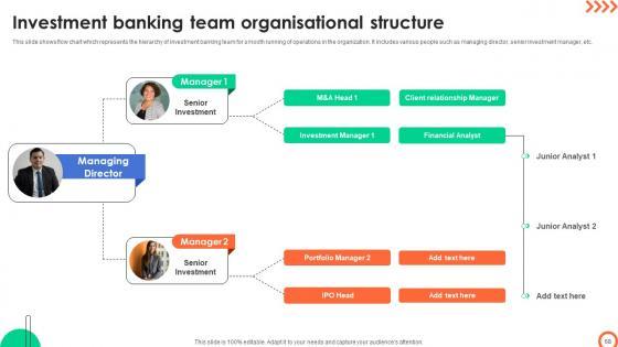 This slide shows flow chart which represents the hierarchy of investment banking team for smooth running of operations in the organization. It includes various people such as managing director, senior investment manager, etc. The Investment Banking Team Organisational Understanding Investment Banking Framework Fin SS V is a compilation of the most recent design trends as a series of slides. It is suitable for any subject or industry presentation, containing attractive visuals and photo spots for businesses to clearly express their messages. This template contains a variety of slides for the user to input data, such as structures to contrast two elements, bullet points, and slides for written information. Slidegeeks is prepared to create an impression. This slide shows flow chart which represents the hierarchy of investment banking team for smooth running of operations in the organization. It includes various people such as managing director, senior investment manager, etc.