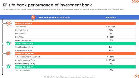 This slide shows various KPIs which can be used to evaluate performance investment banking. It includes metrics such as financial, client satisfaction, assets management, return on equity, capital adequacy, etc. Here you can discover an assortment of the finest PowerPoint and Google Slides templates. With these templates, you can create presentations for a variety of purposes while simultaneously providing your audience with an eye-catching visual experience. Download KPIs To Track Performance Of Investment Bank Understanding Investment Banking Framework Fin SS V to deliver an impeccable presentation. These templates will make your job of preparing presentations much quicker, yet still, maintain a high level of quality. Slidegeeks has experienced researchers who prepare these templates and write high-quality content for you. Later on, you can personalize the content by editing the KPIs To Track Performance Of Investment Bank Understanding Investment Banking Framework Fin SS V. This slide shows various KPIs which can be used to evaluate performance investment banking. It includes metrics such as financial, client satisfaction, assets management, return on equity, capital adequacy, etc.