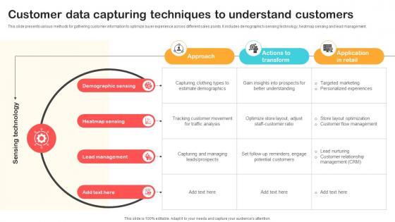This slide presents various methods for gathering customer information to optimize buyer experience across different sales points. It includes demographic tsensing technology, heatmap sensing and lead management.If your project calls for a presentation, then Slidegeeks is your go-to partner because we have professionally designed, easy-to-edit templates that are perfect for any presentation. After downloading, you can easily edit Customer Data Capturing Techniques To Understand Customers DT SS V and make the changes accordingly. You can rearrange slides or fill them with different images. Check out all the handy templates This slide presents various methods for gathering customer information to optimize buyer experience across different sales points. It includes demographic tsensing technology, heatmap sensing and lead management.