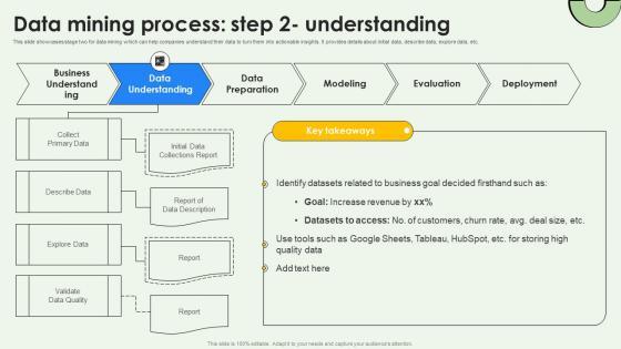 This slide showcases stage two for data mining which can help companies understand their data to turn them into actionable insights. It provides details about initial data, describe data, explore data, etc. From laying roadmaps to briefing everything in detail, our templates are perfect for you. You can set the stage with your presentation slides. All you have to do is download these easy-to-edit and customizable templates. Data Mining Process Step 2 Understanding Data Warehousing And Data Mining Guide AI SS V will help you deliver an outstanding performance that everyone would remember and praise you for. Do download this presentation today. This slide showcases stage two for data mining which can help companies understand their data to turn them into actionable insights. It provides details about initial data, describe data, explore data, etc.
