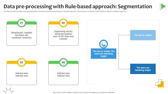 This slide provides information regarding segmentation technique during data-preprocessing in rule-based approach, which acts as a crucial step in transforming raw data into constituent fragments. Find highly impressive Data Pre Processing With Rule Based Sentiment Analysis Demystified Understanding AI SS V on Slidegeeks to deliver a meaningful presentation. You can save an ample amount of time using these presentation templates. No need to worry to prepare everything from scratch because Slidegeeks experts have already done a huge research and work for you. You need to download Data Pre Processing With Rule Based Sentiment Analysis Demystified Understanding AI SS V for your upcoming presentation. All the presentation templates are 100 percent editable and you can change the color and personalize the content accordingly. Download now This slide provides information regarding segmentation technique during data-preprocessing in rule-based approach, which acts as a crucial step in transforming raw data into constituent fragments.