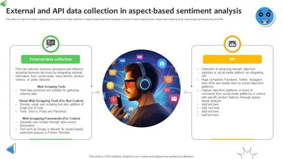 This slide provides information regarding external and API data collection in aspect-based sentiment analysis in terms of web scrapping tools, visual web scrapping tools, web scrapping frameworks, and APIs. Make sure to capture your audiences attention in your business displays with our gratis customizable External And API Data Collection In Aspect Sentiment Analysis Demystified Understanding AI SS V. These are great for business strategies, office conferences, capital raising or task suggestions. If you desire to acquire more customers for your tech business and ensure they stay satisfied, create your own sales presentation with these plain slides. This slide provides information regarding external and API data collection in aspect-based sentiment analysis in terms of web scrapping tools, visual web scrapping tools, web scrapping frameworks, and APIs.