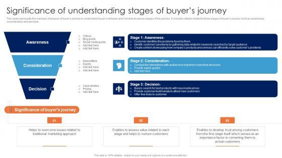 This slide represents the overview of phases of buyers journey to understand buyers behavior and mindset at various stages of his journey. It includes details related to three stages of buyers journey such as awareness, consideration and decision.Welcome to our selection of the Significance Of Understanding Stages Of Buyers Journey Guide For Data Driven Advertising Icons Pdf. These are designed to help you showcase your creativity and bring your sphere to life. Planning and Innovation are essential for any business that is just starting out. This collection contains the designs that you need for your everyday presentations. All of our PowerPoints are 100Precent editable, so you can customize them to suit your needs. This multi-purpose template can be used in various situations. Grab these presentation templates today. This slide represents the overview of phases of buyers journey to understand buyers behavior and mindset at various stages of his journey. It includes details related to three stages of buyers journey such as awareness, consideration and decision.