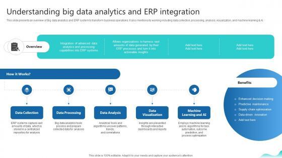 This slide presents an overview of Big data analytics and ERP system to transform business operations. It also mentions its working including data collection, processing, analysis, visualization, and machine learning and AI.There are so many reasons you need a Understanding Big Data Analytics And Erp Integration Erp And Digital Transformation For Maximizing DT SS V. The first reason is you can not spend time making everything from scratch, Thus, Slidegeeks has made presentation templates for you too. You can easily download these templates from our website easily. This slide presents an overview of Big data analytics and ERP system to transform business operations. It also mentions its working including data collection, processing, analysis, visualization, and machine learning and AI.