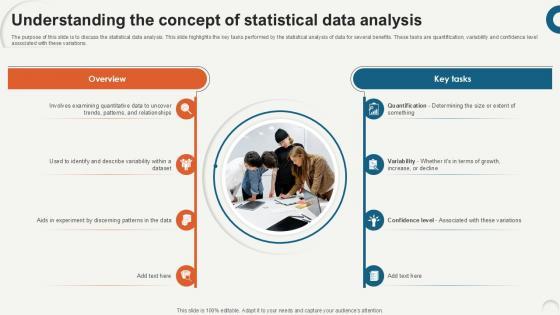 The purpose of this slide is to discuss the statistical data analysis. This slide highlights the key tasks performed by the statistical analysis of data for several benefits. These tasks are quantification, variability and confidence level associated with these variations. Do you have an important presentation coming up Are you looking for something that will make your presentation stand out from the rest Look no further than Understanding The Concept Of Data Analytics For Informed Decision Ppt Template. With our professional designs, you can trust that your presentation will pop and make delivering it a smooth process. And with Slidegeeks, you can trust that your presentation will be unique and memorable. So why wait Grab Understanding The Concept Of Data Analytics For Informed Decision Ppt Template today and make your presentation stand out from the rest The purpose of this slide is to discuss the statistical data analysis. This slide highlights the key tasks performed by the statistical analysis of data for several benefits. These tasks are quantification, variability and confidence level associated with these variations.