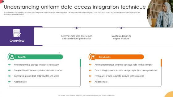 This slide explains the uniform data access integration method used for data integration. The purpose of this slide is to give a brief of the techniques process and explain various benefits and limitations associated with it. This modern and well-arranged Understanding Uniform Data Access Integration Technique Data Integration Strategies For Business provides lots of creative possibilities. It is very simple to customize and edit with the Powerpoint Software. Just drag and drop your pictures into the shapes. All facets of this template can be edited with Powerpoint, no extra software is necessary. Add your own material, put your images in the places assigned for them, adjust the colors, and then you can show your slides to the world, with an animated slide included. This slide explains the uniform data access integration method used for data integration. The purpose of this slide is to give a brief of the techniques process and explain various benefits and limitations associated with it.