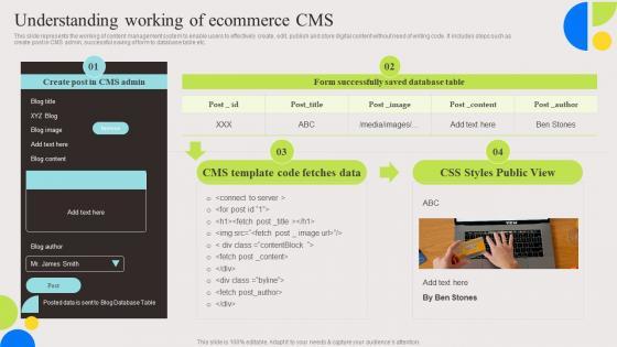 This slide represents the working of content management system to enable users to effectively create, edit, publish and store digital content without need of writing code. It includes steps such as create post in CMS admin, successful saving of form to database table etc. Do you have an important presentation coming up Are you looking for something that will make your presentation stand out from the rest Look no further than Analyzing And Implementing Effective CMS Understanding Working Of Ecommerce CMS Ideas PDF. With our professional designs, you can trust that your presentation will pop and make delivering it a smooth process. And with Slidegeeks, you can trust that your presentation will be unique and memorable. So why wait Grab Analyzing And Implementing Effective CMS Understanding Working Of Ecommerce CMS Ideas PDF today and make your presentation stand out from the rest.