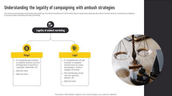 This slide provides glimpse about defining the legitimacy of ambush marketing as it can be either legal or illegal depending upon the extent of actions taken for ambushing competitors. It includes illegal ambushing and legal ambushing. Do you have to make sure that everyone on your team knows about any specific topic I yes, then you should give Understanding The Legality Of Campaigning Automate Guerrilla Promotional Portrait Pdf a try. Our experts have put a lot of knowledge and effort into creating this impeccable Understanding The Legality Of Campaigning Automate Guerrilla Promotional Portrait Pdf You can use this template for your upcoming presentations, as the slides are perfect to represent even the tiniest detail. You can download these templates from the Slidegeeks website and these are easy to edit. So grab these today. This slide provides glimpse about defining the legitimacy of ambush marketing as it can be either legal or illegal depending upon the extent of actions taken for ambushing competitors. It includes illegal ambushing and legal ambushing.