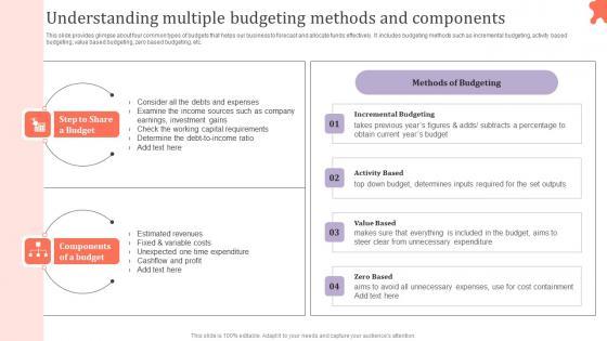This slide provides glimpse about four common types of budgets that helps our business to forecast and allocate funds effectively. It includes budgeting methods such as incremental budgeting, activity based budgeting, value based budgeting, zero based budgeting, etc. Slidegeeks is here to make your presentations a breeze with Adjusting Financial Strategies And Planning Understanding Multiple Budgeting Methods And Components Mockup PDF With our easy to use and customizable templates, you can focus on delivering your ideas rather than worrying about formatting. With a variety of designs to choose from, you are sure to find one that suits your needs. And with animations and unique photos, illustrations, and fonts, you can make your presentation pop. So whether you are giving a sales pitch or presenting to the board, make sure to check out Slidegeeks first.