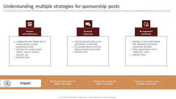 This slide provides glimpse about the different strategies of sponsored posts that helps the bakery to adopt these strategies for boosting sales volume. It includes strategies such as partner with influencers, exclusive discounts, etc.Do you know about Slidesgeeks Understanding Multiple Strategies For Sponsorship Posts Strategic Advertising Plan For Bakehouse Clipart Pdf These are perfect for delivering any kind od presentation. Using it, create PowerPoint presentations that communicate your ideas and engage audiences. Save time and effort by using our pre designed presentation templates that are perfect for a wide range of topic. Our vast selection of designs covers a range of styles, from creative to business, and are all highly customizable and easy to edit. Download as a PowerPoint template or use them as Google Slides themes. This slide provides glimpse about the different strategies of sponsored posts that helps the bakery to adopt these strategies for boosting sales volume. It includes strategies such as partner with influencers, exclusive discounts, etc.