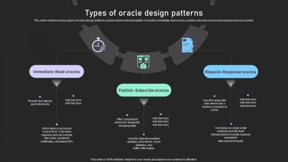 This slide mentions various types of oracle design patterns used to acheive interoperability. It includes immediate read oracles, publish subscribe oracles and request response oracles. Do you have an important presentation coming up Are you looking for something that will make your presentation stand out from the rest Look no further than Understanding Various Blockchain Types Of Oracle Design Patterns BCT SS V. With our professional designs, you can trust that your presentation will pop and make delivering it a smooth process. And with Slidegeeks, you can trust that your presentation will be unique and memorable. So why wait Grab Understanding Various Blockchain Types Of Oracle Design Patterns BCT SS V today and make your presentation stand out from the rest This slide mentions various types of oracle design patterns used to acheive interoperability. It includes immediate read oracles, publish subscribe oracles and request response oracles.