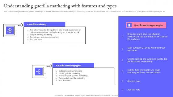 This slide provides glimpse about guerilla marketing that can help our business to develop strategies for boosting online and offline presence and increase profits. It includes description, types, guerilla marketing strategies, etc. Are you in need of a template that can accommodate all of your creative concepts This one is crafted professionally and can be altered to fit any style. Use it with Google Slides or PowerPoint. Include striking photographs, symbols, depictions, and other visuals. Fill, move around, or remove text boxes as desired. Test out color palettes and font mixtures. Edit and save your work, or work with colleagues. Download Understanding Guerilla Buzz Marketing Techniques For Engaging Infographics Pdf and observe how to make your presentation outstanding. Give an impeccable presentation to your group and make your presentation unforgettable. This slide provides glimpse about guerilla marketing that can help our business to develop strategies for boosting online and offline presence and increase profits. It includes description, types, guerilla marketing strategies, etc.