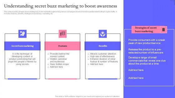 This slide provides glimpse about creating buzz in the market through running various campaigns around a secret subject product to attract organic traffic. It includes features, benefits, strategies of secret buzz marketing, etc. This modern and well arranged Understanding Secret Buzz Marketing Techniques For Engaging Inspiration Pdf provides lots of creative possibilities. It is very simple to customize and edit with the Powerpoint Software. Just drag and drop your pictures into the shapes. All facets of this template can be edited with Powerpoint no extra software is necessary. Add your own material, put your images in the places assigned for them, adjust the colors, and then you can show your slides to the world, with an animated slide included. This slide provides glimpse about creating buzz in the market through running various campaigns around a secret subject product to attract organic traffic. It includes features, benefits, strategies of secret buzz marketing, etc.