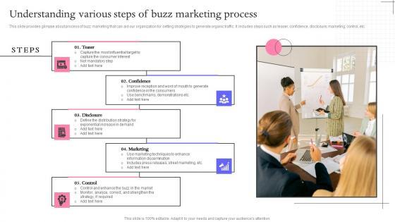 This slide provides glimpse about process of buzz marketing that can aid our organization for setting strategies to generate organic traffic. It includes steps such as teaser, confidence, disclosure, marketing, control, etc. Explore a selection of the finest Understanding Various Steps Buzz Marketing Techniques For Engaging Elements Pdf here. With a plethora of professionally designed and pre made slide templates, you can quickly and easily find the right one for your upcoming presentation. You can use our Understanding Various Steps Buzz Marketing Techniques For Engaging Elements Pdf to effectively convey your message to a wider audience. Slidegeeks has done a lot of research before preparing these presentation templates. The content can be personalized and the slides are highly editable. Grab templates today from Slidegeeks. This slide provides glimpse about process of buzz marketing that can aid our organization for setting strategies to generate organic traffic. It includes steps such as teaser, confidence, disclosure, marketing, control, etc.