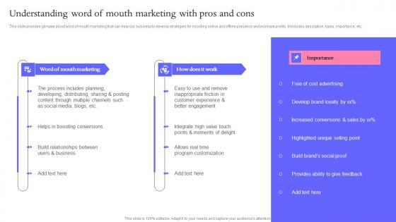 This slide provides glimpse about word of mouth marketing that can help our business to develop strategies for boosting online and offline presence and increase profits. It includes description, types, importance, etc. Are you searching for a Understanding Word Of Mouth Buzz Marketing Techniques For Engaging Download Pdf that is uncluttered, straightforward, and original It is easy to edit, and you can change the colors to suit your personal or business branding. For a presentation that expresses how much effort you have put in, this template is ideal With all of its features, including tables, diagrams, statistics, and lists, it is perfect for a business plan presentation. Make your ideas more appealing with these professional slides. Download Understanding Word Of Mouth Buzz Marketing Techniques For Engaging Download Pdf from Slidegeeks today. This slide provides glimpse about word of mouth marketing that can help our business to develop strategies for boosting online and offline presence and increase profits. It includes description, types, importance, etc.