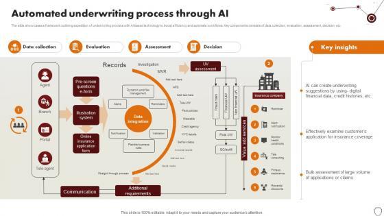 The slide showcases a framework outlining expedition of underwriting process with AI based technology to boost efficiency and automate workflows. Key components consists of data collection, evaluation, assessment, decision, etc. Make sure to capture your audiences attention in your business displays with our gratis customizable Implementation Of Digital Advancement Techniques Automated Underwriting Process Information PDF. These are great for business strategies, office conferences, capital raising or task suggestions. If you desire to acquire more customers for your tech business and ensure they stay satisfied, create your own sales presentation with these plain slides.