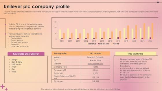 This slide provides information related to Unilever which manufactures and supplies consumer goods. It covers basic details such as company type, revenue generated, profit earned, key brands under company, and current market value of company. Are you searching for a Unilever Plc Company Profile Makeup And Skincare Market IR SS V that is uncluttered, straightforward, and original Its easy to edit, and you can change the colors to suit your personal or business branding. For a presentation that expresses how much effort you have put in, this template is ideal With all of its features, including tables, diagrams, statistics, and lists, its perfect for a business plan presentation. Make your ideas more appealing with these professional slides. Download Unilever Plc Company Profile Makeup And Skincare Market IR SS V from Slidegeeks today. This slide provides information related to Unilever which manufactures and supplies consumer goods. It covers basic details such as company type, revenue generated, profit earned, key brands under company, and current market value of company.