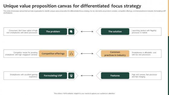 This slide showcases canvas that can help organization to identify unique value proposition for differentiated focus strategy. Its key elements are problem, solution, competitor offerings, common practices in industry, formulating USP and features. If your project calls for a presentation, then Slidegeeks is your go to partner because we have professionally designed, easy to edit templates that are perfect for any presentation. After downloading, you can easily edit Unique Value Proposition Canvas For Differentiated Focus Strategy Elements PDF and make the changes accordingly. You can rearrange slides or fill them with different images. Check out all the handy templates.