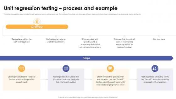 This slide discusses the steps for conducting unit testing in software development of organization. The purpose of this slide is to highlight the process stages of first regression testing technique, that is, unit regression testing. The Steps To Conduct Unit Regression Automated Regression Testing And Achieving PPT Example is a compilation of the most recent design trends as a series of slides. It is suitable for any subject or industry presentation, containing attractive visuals and photo spots for businesses to clearly express their messages. This template contains a variety of slides for the user to input data, such as structures to contrast two elements, bullet points, and slides for written information. Slidegeeks is prepared to create an impression. This slide discusses the steps for conducting unit testing in software development of organization. The purpose of this slide is to highlight the process stages of first regression testing technique, that is, unit regression testing.