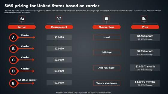 This slide represents the details related to pricing plans for different SMS carriers to help enterprise to draw their SMS marketing budget accordingly. It includes details related to carriers and their price per messages sent and prices for different types of numbers. Slidegeeks is here to make your presentations a breeze with SMS Pricing For United States Based On Carrier SMS Promotional Tactics Portrait PDF With our easy-to-use and customizable templates, you can focus on delivering your ideas rather than worrying about formatting. With a variety of designs to choose from, you are sure to find one that suits your needs. And with animations and unique photos, illustrations, and fonts, you can make your presentation pop. So whether you are giving a sales pitch or presenting to the board, make sure to check out Slidegeeks first This slide represents the details related to pricing plans for different SMS carriers to help enterprise to draw their SMS marketing budget accordingly. It includes details related to carriers and their price per messages sent and prices for different types of numbers.