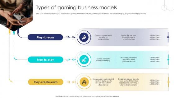 This slide mentions various types of blockchain gaming models that sets the gameplay mechanism. It includes free to play, play to earn and play to earn. This Unlocking The Potential Of Types Of Gaming Business Models BCT SS V from Slidegeeks makes it easy to present information on your topic with precision. It provides customization options, so you can make changes to the colors, design, graphics, or any other component to create a unique layout. It is also available for immediate download, so you can begin using it right away. Slidegeeks has done good research to ensure that you have everything you need to make your presentation stand out. Make a name out there for a brilliant performance. This slide mentions various types of blockchain gaming models that sets the gameplay mechanism. It includes free to play, play to earn and play to earn.