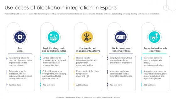 This slide highlights various use cases of blockchain integration in Esports to explore new innovations and revenue streams. It includes fan tokens, digital trading, fan loyalty, ticketing systems and decentralization. Take your projects to the next level with our ultimate collection of Unlocking The Potential Of Use Cases Of Blockchain Integration In Esports BCT SS V. Slidegeeks has designed a range of layouts that are perfect for representing task or activity duration, keeping track of all your deadlines at a glance. Tailor these designs to your exact needs and give them a truly corporate look with your own brand colors they will make your projects stand out from the rest This slide highlights various use cases of blockchain integration in Esports to explore new innovations and revenue streams. It includes fan tokens, digital trading, fan loyalty, ticketing systems and decentralization.