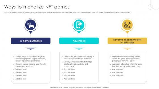 This slide mentions various strategies that can be implemented by game developers to achieve monetization. Key models include in game purchases, advertising and revenue sharing models. Find a pre-designed and impeccable Unlocking The Potential Of Ways To Monetize Nft Games BCT SS V. The templates can ace your presentation without additional effort. You can download these easy-to-edit presentation templates to make your presentation stand out from others. So, what are you waiting for Download the template from Slidegeeks today and give a unique touch to your presentation. This slide mentions various strategies that can be implemented by game developers to achieve monetization. Key models include in game purchases, advertising and revenue sharing models.