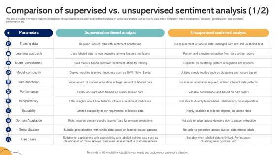 This slide provides information regarding comparison of supervised and unsupervised sentiment analysis on various parameters such as training data, model complexity, model development, scalability, generalization, data annotation, performance, etc. Slidegeeks is here to make your presentations a breeze with Comparison Of Supervised Vs Unsupervised Sentiment Analysis Demystified Understanding AI SS V With our easy-to-use and customizable templates, you can focus on delivering your ideas rather than worrying about formatting. With a variety of designs to choose from, you are sure to find one that suits your needs. And with animations and unique photos, illustrations, and fonts, you can make your presentation pop. So whether you are giving a sales pitch or presenting to the board, make sure to check out Slidegeeks first This slide provides information regarding comparison of supervised and unsupervised sentiment analysis on various parameters such as training data, model complexity, model development, scalability, generalization, data annotation, performance, etc.