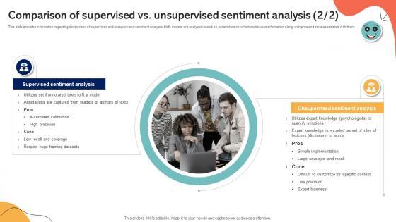 This slide provides information regarding comparison of supervised and unsupervised sentiment analysis on various parameters such as training data, model complexity, model development, scalability, generalization, data annotation, performance, etc. Slidegeeks is here to make your presentations a breeze with Comparison Of Supervised Vs Unsupervised Sentiment Emotionally Intelligent Insights Leveraging AI SS V With our easy-to-use and customizable templates, you can focus on delivering your ideas rather than worrying about formatting. With a variety of designs to choose from, you are sure to find one that suits your needs. And with animations and unique photos, illustrations, and fonts, you can make your presentation pop. So whether you are giving a sales pitch or presenting to the board, make sure to check out Slidegeeks first This slide provides information regarding comparison of supervised and unsupervised sentiment analysis on various parameters such as training data, model complexity, model development, scalability, generalization, data annotation, performance, etc.
