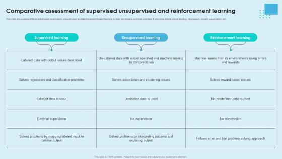 This slide showcases difference between supervised, unsupervised and reinforcement based learning to help developers sort their priorities. It provides details about labeling, regression, reward, association, etc. Are you in need of a template that can accommodate all of your creative concepts This one is crafted professionally and can be altered to fit any style. Use it with Google Slides or PowerPoint. Include striking photographs, symbols, depictions, and other visuals. Fill, move around, or remove text boxes as desired. Test out color palettes and font mixtures. Edit and save your work, or work with colleagues. Download Reinforcement Learning Unveiled Comparative Assessment Of Supervised Unsupervised AI SS V and observe how to make your presentation outstanding. Give an impeccable presentation to your group and make your presentation unforgettable. This slide showcases difference between supervised, unsupervised and reinforcement based learning to help developers sort their priorities. It provides details about labeling, regression, reward, association, etc.