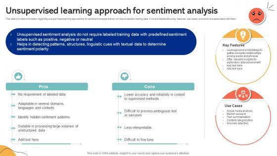 This slide provides information regarding unsupervised learning approaches for sentiment analysis that do not require labeled training data. It covers details about key features, use cases, pros and cons associated with them. Coming up with a presentation necessitates that the majority of the effort goes into the content and the message you intend to convey. The visuals of a PowerPoint presentation can only be effective if it supplements and supports the story that is being told. Keeping this in mind our experts created Unsupervised Learning Approach For Sentiment Analysis Emotionally Intelligent Insights Leveraging AI SS V to reduce the time that goes into designing the presentation. This way, you can concentrate on the message while our designers take care of providing you with the right template for the situation. This slide provides information regarding unsupervised learning approaches for sentiment analysis that do not require labeled training data. It covers details about key features, use cases, pros and cons associated with them.