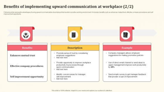 Following slide exhibits advantages of using open communication to maintain manager employee relationship. It include pointers such as create awareness, encourage interaction, support employee participation, increase morale etc. Create an editable Benefits Of Implementing Upward Communication At Workplace Ppt PowerPoint Presentation File Outline PDF that communicates your idea and engages your audience. Whether youre presenting a business or an educational presentation, pre designed presentation templates help save time. Benefits Of Implementing Upward Communication At Workplace Ppt PowerPoint Presentation File Outline PDF is highly customizable and very easy to edit, covering many different styles from creative to business presentations. Slidegeeks has creative team members who have crafted amazing templates. So, go and get them without any delay.
