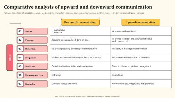 Following slide exhibits difference between upward and downward communication. It includes pointers such as nature, purpose, distortion, frequency, direction, management type and examples. Coming up with a presentation necessitates that the majority of the effort goes into the content and the message you intend to convey. The visuals of a PowerPoint presentation can only be effective if it supplements and supports the story that is being told. Keeping this in mind our experts created Comparative Analysis Of Upward And Downward Communication Detailed Personnel Rules Pdf to reduce the time that goes into designing the presentation. This way, you can concentrate on the message while our designers take care of providing you with the right template for the situation. Following slide exhibits difference between upward and downward communication. It includes pointers such as nature, purpose, distortion, frequency, direction, management type and examples.